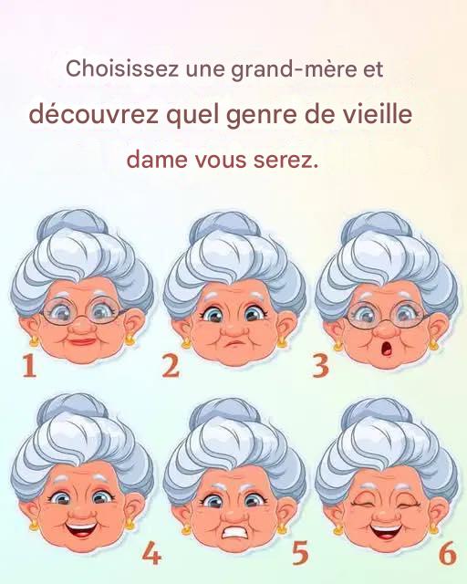 Vieillir est un voyage riche en sagesse, en expériences et, il faut bien le dire, en petites manies. Qu’on le veuille ou non, nous nous transformons tous en vieillissant, développant des traits uniques qui définissent nos années d’or. Cette image amusante vous invite à choisir une grand-mère et à découvrir quel genre de femme âgée vous pourriez devenir. Alors, laquelle représente le mieux votre futur moi ? Découvrons-le !