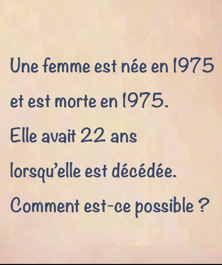 Imaginez : vous tombez sur cette phrase étrange en faisant défiler votre fil d’actualité. « Une femme est née en 1975 et décédée en 1975. Elle avait 22 ans. » Ça vous stoppe net. Incompréhensible ? Déconcertant ? Forcément, il y a un piège quelque part… Mais où ? Accrochez-vous, car cette énigme bouscule notre logique, nos automatismes, et demande un soupçon d’imagination. Et si la clé était justement de ne pas penser comme d’habitude ?