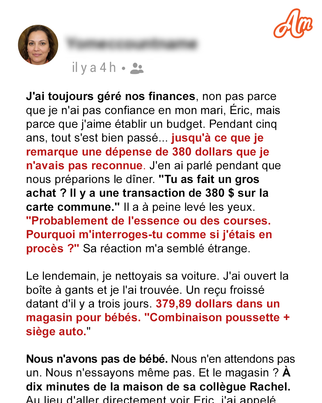 Le budget, c’est mon truc, et c’est pourquoi je fais le suivi de toutes les transactions du ménage. Alors, quand mon mari m’a reproché de poser des questions sur une dépense, j’ai commencé à être curieuse. Lorsque j’ai trouvé un reçu de 380 $ pour une poussette de bébé dans sa voiture, j’ai cessé de poser des questions et j’ai commencé à relier les points… parce que nous n’avons pas de bébé.